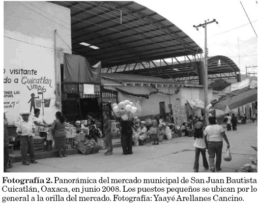 El mercado de Cuicatlán se ubica en el centro de San Juan Bautista Cuicatlán (fotografía 2). Existen cerca de 50 puestos fijos, y en los días de plaza, viernes y sábado, se establecen entre 30 y 50 puestos flotantes, con personas que provienen de distintas localidades (tabla 2). La mayoría de puestos no establecidos son de vendedores indígenas hablantes de cuicateco. Este mercado se abastece de productos provenientes de la ciudad de Oaxaca como mole, chocolate, pan, quesillo, queso fresco, tlayudas y verduras del estado de Puebla. Existen muchos puestos no establecidos con productos fabricados con palma, la mayoría de ellos provenientes de San Pedro Nodón, San Pedro Jocotipac y Santa María Ixcatlán, quienes también comercian frijoles y trigo. Muchos transeúntes tienen la cultura de utilizar bolsas de mandado, o canastos, o incluso carteras decoradas hechas con palma (Brahea dulcis). La zona es productora de limón (Citrus limon), melón (Cucumis melo), papaya (Carica papaya), mango, ciruela, berenjena (Solanum lanceolatum) y angú (Abelmoschus esculentus), por lo que es frecuente ver estos productos en el mercado en su temporada de cosecha.