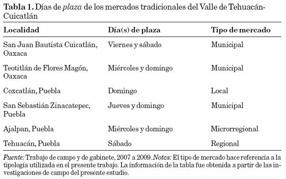Cada uno de los mercados estudiados tiene particularidades, pero en general todos: a) tienen una estructura física sólida que los delimita, b) existen "días de plaza" en los que concurren más vendedores que los habituales, c) en los días de plaza acuden vendedores y compradores de zonas aledañas, muchos de ellos indígenas, d) los sitios en donde se encuentran ubicados los mercados son principalmente cabeceras municipales, e) al interior del mercado las personas reconocen una clasificación para los vendedores no establecidos o sin un puesto fijo, como "propios", "regatones" y "ambulantes", f se intercambian productos entre vendedores y compradores, aunque en Cuicatlán este intercambio se presenta sólo entre vendedores, g) a excepción de Coxcatlán, todos los mercados que se visitaron tienen dos "días de plaza" (tabla 1) y h) en todos los mercados, a pesar de la sencillez del puesto y de los productos que se expenden, se cobra un impuesto por uso de suelo a los puestos no establecidos (durante 2007-2008 el impuesto fue de tres pesos). En el caso de los puestos fijos la cuota depende del tamaño del puesto y de su giro.