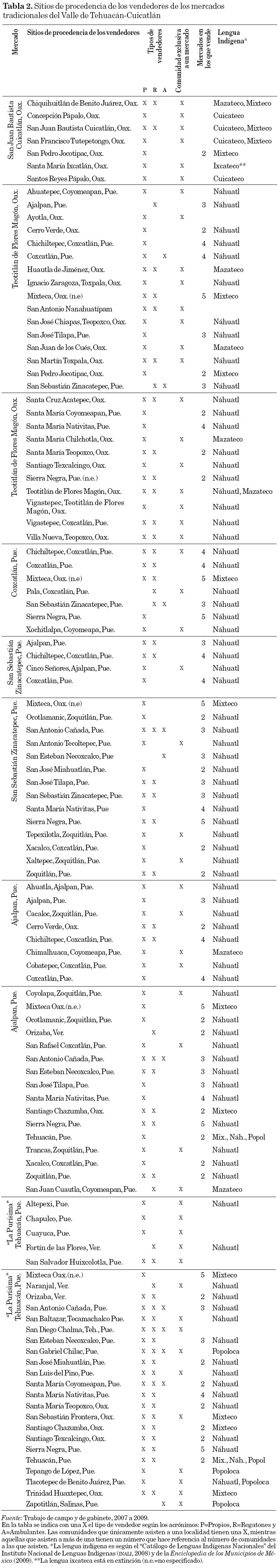 El mercado de Coxcatlán se considera local o comunal, pues aun cuando se encuentra en la cabecera de un municipio, los vendedores flotantes que llegan provienen en su mayoría de localidades aledañas y de la misma comunidad de Coxcatlán (tabla 1). De hecho, algunos vendedores de Chichiltepec, una de las principales comunidades que llegan al mercado de Coxcatlán, comentaron que prefieren ir a otras plazas como la de Ajalpan por ser más diversas en productos que se pueden intercambiar. La plaza de Cuicatlán se considera como un mercado municipal, pues aunque no tiene muchos vendedores flotantes, algunos de ellos provienen de sitios lejanos y recorren hasta cinco o seis horas para llegar al mercado. Además, la plaza de Cuicatlán se caracteriza por tener el mayor número de puestos fijos constantes y presentar un frecuente intercambio de productos provenientes de la ciudad de Oaxaca. El mercado de Teotitlán se consideró como municipal porque recibe a numerosos vendedores "propios" de diferentes localidades. San Sebastián Zinacatepec también se consideró como un mercado regional porque presenta numerosos revendedores o "regatones" que compran productos en la plaza de Ajalpan del día anterior y los revenden; además tiene vendedores "propios" que provienen de otras localidades. El mercado microrregional de Ajalpan es muy grande pero de menor tamaño comparado con el mercado "La Purísima" de Tehuacán, que acapara productos locales, regionales y nacionales en altos volúmenes.