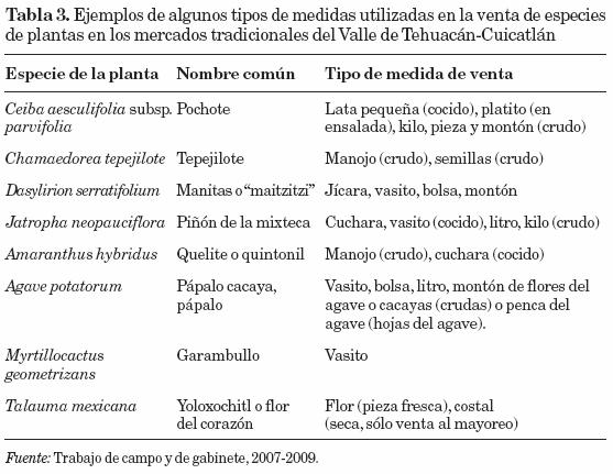 En los mercados tradicionales del Valle de Tehuacán-Cuicatlán son diversos los tipos de medidas que se utilizan para comercializar los productos. Dependiendo de los productos, éstos se pueden intercambiar por pieza, manojo, montón, puño, vasito, jícara, bolsa, cubeta, huacal, costal, lata de acero grande que se denomina "litro", mediana o "medio litro", o pequeña o "un cuarto", cucharada o por peso en gramos, un medio kilo, un cuarto de kilo, etc. También se le llama "medida" a las unidades de venta de un producto en un recipiente de capacidad variable. Todas las medidas que adoptan un utensilio son arbitrarias; cada vendedor elige su medida, y ésta puede diferir significativamente del que usa otro. La única medida invariable es la que implica el uso de una báscula. Un sólo producto se puede vender con distintas medidas, pero algunas hierbas como los quelites, "huele de noche" (Cestrum nocturmun), "hierba mora" (Solanum nigrescens), Witheringia solanacea, "pipicha" (Porophyllum linaria), "papaloquelite" (Porophyllum macrocephalum), "quintoniles" (Amaranthus hybridus), sólo se venden por manojo.