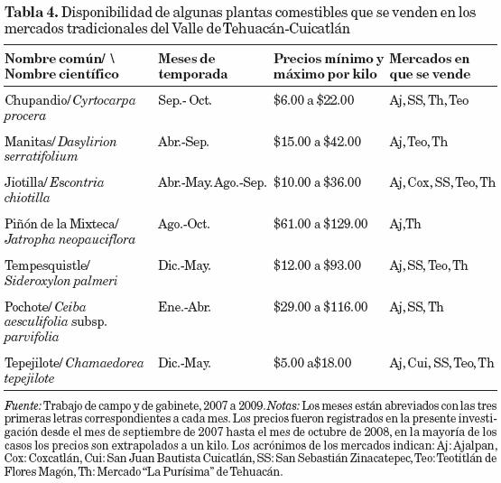Con respecto al tercer inciso, la disponibilidad temporal de un recurso hace referencia a la presencia de un recurso en el mercado de acuerdo con sus características biológicas. Muchos recursos se pueden encontrar a lo largo de todo el año, pero existen algunos que sólo se encuentran en determinadas fechas. La disponibilidad de un recurso además influye en su costo. En la tabla 4 se puede observar la disponibilidad temporal de algunos de los recursos que se comercializan y el intervalo de precios que presentan. Los precios varían al inicio o al final de la temporada y se estabilizan cuando la producción se encuentra en auge, tiempo de mayor disponibilidad de un recurso, cuando su cosecha está en el punto máximo. En el mercado los vendedores consideran que "no todos los años son iguales" y el volumen de los productos puede cambiar de un año respecto a otro. Este patrón es más evidente en cactáceas como las tetechas, el cardón y el xoconostle, pues debido al ciclo de vida que tienen las plantas los vendedores estiman que "un año se da mucho y otro se da poco". Otro ejemplo es el piñón (Pinus cembroides), que sólo se produce cada dos a cuatro años, de acuerdo con lo que dicen los vendedores. Para este recurso en específico, los vendedores consideran que "los patrones de producción están cambiando con el clima".