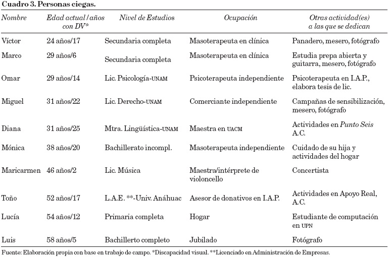Otro elemento de ruptura de los entrevistados con esta imagen de la discapacidad como pobreza corresponde a sus actividades económicas, y que están en estrecha relación con el nivel de estudios alcanzado; entre ellas se encuentran las de masoterapeuta, psicoterapeuta independiente, comerciante, traductora, maestra de música e intérprete de violonchelo, asesor de donativos, jubilado, ama de casa, estudiante, empleados en aseguradoras y museos, panaderos, meseros y fotógrafos. En cuanto a la edad de los entrevistados, se trata en su mayoría de jóvenes que van de 22 a 31 años, siendo los demás adultos que oscilaban entre 46 y 58 años. Casi la totalidad de los entrevistados vive con sus padres o respectivos cónyuges e hijos; declararon residir en familias de clase media-baja que viven con los ingresos necesarios para los gastos del día a día. La mayoría de esos hogares no cuentan con automóvil, por lo que todos se desplazan en transporte público. Otra característica es que al menos alguno de sus miembros se dedica a laborar en el ramo informal de la economía, debido a la dificultad de encontrar un empleo remunerado en el mercado formal de trabajo.