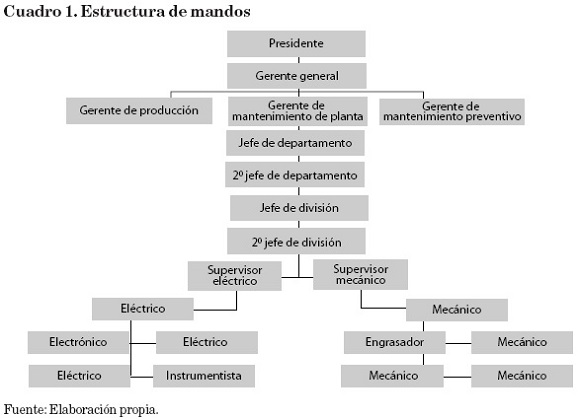 Otro elemento, que fue el que sentó las bases del conflicto de 1991, fue la estructura de mandos, la gran cantidad de jerarquías que componían la estructura organizacional de la empresa. Por ejemplo, en 1987, la estructura de mandos del sector de Mantenimiento de Planta eran las que se muestran en el cuadro 1.