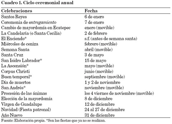 Por su parte, María Ana Portal (1997: 14) sostiene que el sistema de cargos no es una institución que se pueda encontrar particularmente en los pueblos indios; también los pueblos campesinos, aun cuando han abandonado su identidad étnica india, han conservado el antiguo ciclo ceremonial y algunos de sus rituales. Como es el caso de antiguos pueblos y barrios que han sido alcanzados por el proceso de urbanización y hoy son parte de la ciudad. En este contexto urbano los lugareños, como sostiene Medina, responden creativamente a las presiones que amenazan su existencia misma de muy diversas maneras; reelaboran su historia o la representan en sus ceremonias, pero todo ello responde a una lógica que tiene sus referentes generales en una visión del mundo nutrida de la tradición religiosa mesoamericana (Medina, 2007: 120).