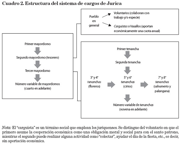 En Jurica el sistema de cargos se estructuró a partir de la mayordomía y las tenanchas. En la primera organización recae la responsabilidad de la recaudación de limosnas, la administración y celebración de las fiestas; en la segunda, su responsabilidad directa es la del servicio todo lo relacionado al mantenimiento, orden, y limpieza del espacio, los objetos simbólicos y las imágenes rituales. Es un sistema de cargos que carece de escalafón y donde prevalece la horizontalidad. Además, se trata de un sistema donde existe una clara separación entre la jerarquía religiosa y la jerarquía político civil. Por un lado desempeñan sus funciones los mayordomos y, por otro, el subdelegado y el comisariado ejidal.