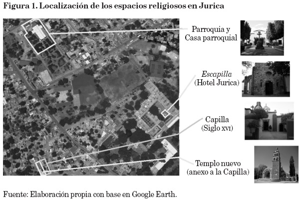 En 1980 se inauguró la nueva iglesia, se construyó junto a la plaza y es la sede de la Parroquia del Señor de la Piedad, y junto a la nueva parroquia se edificó también la casa parroquial7 (en la figura 1 se muestra la localización de los espacios religiosos en Jurica a que hago referencia). Este cambio no sólo implicó que los sacerdotes llegaron a vivir de manera permanente al pueblo, sino que a través de sus acciones comenzaran a evidenciarse diferencias que por años se habían logrado sobrellevar, sin fracturar del todo las relaciones intracomunitarias.