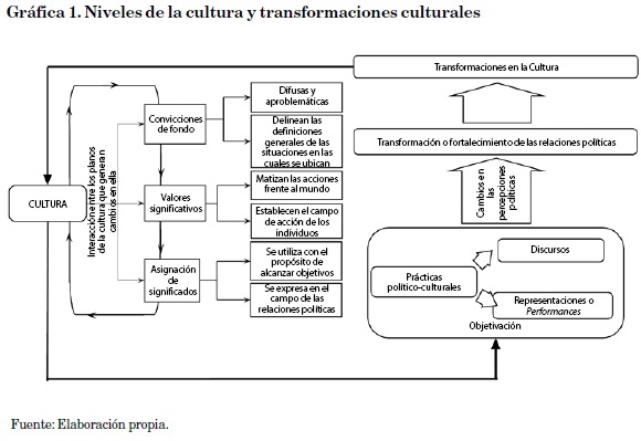Las relaciones políticas expresan pugnas sobre cómo nombrar y clasificar las relaciones sociales apuntalando "campos" de significación social. Siendo el espacio del ejercicio político, en este tercer nivel se ponen en constante tensión las convicciones, los sentidos y las atribuciones, las cuales dinamizan sus contenidos. Ha sido este último plano en el cual se ha concentrado el análisis realizado en los últimos años, porque la asignación de significados sustenta la posibilidad de que los actores o grupos sociales que se enfrentan políticamente, refuercen o cuestionen los contenidos dominantes de la cultura; contenidos delineados por una determinada correlación de las relaciones de poder (Dagnino, 1998). La política está matizada por dicha asignación y propicia -más no garantiza, como se expone más adelante- su eficacia. Este proceso se ha designado como objetivación de la cultura,2 y se realiza a través de prácticas como discursos y performances culturales sobre las relaciones políticas existentes, o de aquellas que se desea establecer. A través de la objetivación se propician cambios en las percepciones políticas que, a su vez, son las causantes de transformaciones en las relaciones políticas; relaciones que, al cambiar, también modifican los contenidos de la cultura.
