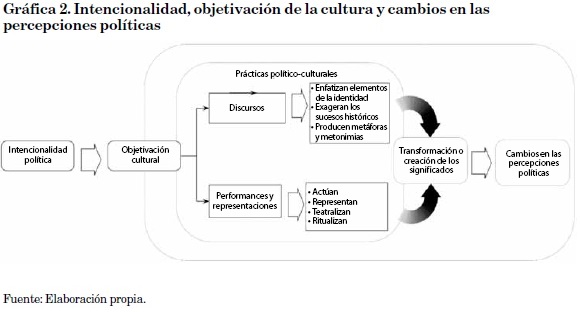 2 Se entiende como objetivación cultural el conjunto de prácticas dirigidas a reforzar o cuestionar los significados sobre las relaciones políticas e implantar fronteras de significado sobre las relaciones sociales (Tejera, 2005).