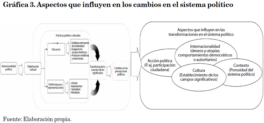 En efecto, si la propuesta se restringiera a la eficacia de las prácticas político-culturales para explicar el cambio político se ubicaría en el reduccionismo culturalista. Pero cabe precisar que las prácticas empleadas para ejercer o enfrentarse a la dominación integran tanto la constitución de ámbitos significativos como la intencionalidad de los actores sociales, pero no garantizan las transformaciones en las relaciones políticas. Dichas transformaciones dependen -por decirlo metafóricamente- de la "porosidad" del sistema político; de la posibilidad de que se pueda influirlo con base en la acción política. En otros términos, las transformaciones sociales derivan de la intencionalidad resultante de las necesidades, deseos y utopías de los sujetos sociales; su capacidad de convertir éstas en campos culturalmente significativos para otros sujetos o grupos sociales; transformar los sentidos derivados de dichos campos en acción o participación política en su sentido más amplio, y realizarse en un contexto donde dicha participación influye en las relaciones y el sistema político. Esta perspectiva explica el cambio político rebasando tanto las perspectivas institucionales de la política, como en las visiones normativas de la cultura (Lieberman, 2002). Como puede observarse en la gráfica 3, la cultura entendida como el establecimiento de campos significativos es solamente uno de los elementos que influyen en las transformaciones del sistema político. Los otros tres son la intencionalidad, con su carga de percepciones e información matizados por la cultura y el contexto social; las características de la acción política, que pueden ser eficientes para lograr los propósitos propuestos o generar el efecto contrario al deseado, y la forma en que el sistema político responde ante los otros elementos.