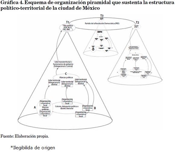 Han integrado un amplio entramado de organizaciones vinculadas con base en alianzas y adhesiones para ejercer un eficiente dominio político-electoral sobre colonias, delegaciones o distritos electorales (A); también encontramos varias organizaciones locales relacionadas con líderes que controlan territorios más extensos (B); dichos líderes se alían para formar frentes políticos (C); asociándose, a su vez, con dirigentes transterritoriales que encabezan varias estructuras territoriales (T1, T2, T3). En conjunto, estas redes se integran jerárquicamente a facciones políticas partidarias. La forma en que ellas se constituyen, recuerdan lo que Pansters (1997) sostuvo: los defeños son habitantes de las pirámides sujetos a relaciones políticas centralizadas, verticales y aglutinadas con base en la personalización. La gráfica 4 nos muestra el relativamente dinámico proceso de integración, expansión y contracción político-territorial de las redes, como resultado de la asociación, ascenso, escisión y decadencia de sus líderes en su intención por incrementar su influencia política y poder económico; sin embargo, ilustra el esquema general que caracteriza su estructura.