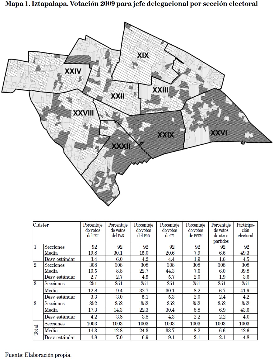 Al correlacionar la información electoral con la etnográfica sobre la influencia territorial de las facciones políticas en los distritos electorales de Iztapalapa; el número y lugar de las asambleas informativas realizadas por López Obrador antes de las elecciones del 2009; las facciones a las que pertenecieron los candidatos a diputados locales; los resultados electorales del 2009 analizados con base en los clústers presentados en el mapa 1, así como los índices de desarrollo social por sección electoral, se desprende lo siguiente: Los distritos XXVI, XXIX y XXXII, que muestran un grado de desarrollo social muy bajo, son aquellos donde el PT obtiene mayor cantidad de votos. Los clústers muestran que la media de votos a favor del PT fue de 44.3%, mientras que de 22.7%, para el PRD. El distrito XXVI se caracteriza por la influencia de grupos como la üprez, a la cual pertenece Brugada, y liderazgos locales asociados con Arturo Santana. Siendo así, las secciones de este distrito se repartieron de forma relativamente equitativa entre el PRD y el PT, como se muestra en el mapa citado. En el distrito XXIX el voto para el PT es mayoritario para la jefatura delegacional. Aquí predominan Izquierda Democrática Nacional (IDN) y el Frente Popular Francisco Villa (FPFV), quienes apoyaron a Brugada. En el distrito XXXII los grupos políticos se disputan el territorio. Por un lado, en los resultados a jefe delegacional, Nueva Izquierda gana aproximadamente la mitad de las secciones electorales, promoviendo el voto por Oliva; por su parte, el Movimiento de Equidad Social de Izquierdas (MESI) y el IDN ganan las demás secciones. En el distrito XIX se impone Brugada, quien es impulsada por el MESI. Los distritos XXII y XXIII se comportan de manera multicolor, pero ni gana la mayoría de las secciones electorales en la votación para jefe delegacional. En el distrito XXVIII triunfa el PT. En este distrito se ubican zonas con índices de desarrollo social medio y alto que votan por el PAN y las secciones electorales tradicionalmente perredistas votaron por el PT. "Los Morales" son líderes de organizaciones en el distrito XXIV y sus integrantes, ligados a ni han ocupado puestos legislativos, y la votación es para el PRD.