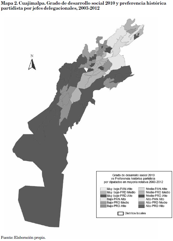 En el mapa 2 se correlacionan los clústers de los resultados electorales de 2003-2012 con el índice de desarrollo social elaborado por el Consejo de Evaluación de Desarrollo Social (Evalúa-DF). Para elaborar los mapas, los límites de las unidades territoriales se han interrelacionado con las secciones electorales. Esto permitió ubicar zonas con distintos niveles de bienestar y desempeño partidario-electoral. Este mapa se conjunta con la investigación etnográfica y permite sostener que, en términos similares a los que encontramos en Iztapalapa, el comportamiento electoral es consecuencia de la interinfluencia de varios factores. En Cuajimalpa se estudiaron las razones por las cuales el PRI ganó en las elecciones de 2012 con un candidato proveniente de las filas del PRD. Entre los elementos más significativos que explican dicho triunfo destacan, primero, la labor proselitista que vincula a las redes locales con los funcionarios delegacionales; en este caso, particularmente con el director Jurídico y de Gobierno (2006-2008), Adrián Rubalcava; segundo, la reacción adversa entre la ciudadanía por el deficiente desempeño del delegado panista (2009-2012); tercero, el proselitismo con base en gasto social y apoyo para gestión por parte de Rubalcava, quien de 2009 a 2012 ocupó el cargo de director general de Fomento Económico en el gobierno de la Ciudad de México; cuarto, la negociación entre el líder de la IDN y el jefe de Gobierno para elegir como candidato para esa demarcación a una persona con vínculos y acuerdos endebles con las redes y los sectores beneficiarios de gasto social; quinto, la disminución de votos para el PAN -a pesar de la campaña permanente y la consolidación de clientelas en la delegación- debido al descrédito de la administración federal, los conflictos intrapartidarios por las candidaturas en la ciudad de México y, en el caso de Cuajimalpa, por la judicialización de la pugna entre sus aspirantes.