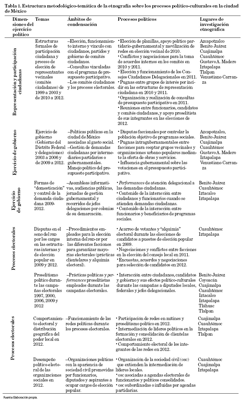 Para profundizar en la naturaleza de los procesos políticos se han buscado aquellos campos de reproducción de la dominación que expresan dimensiones de ejercicio político, los cuales se han dividido en temas y estudiado en diversos ámbitos de condensación que, a su vez, reflejan procesos político-territoriales donde la interinfluencia entre ciudadanía, gobierno y partidos políticos adquiere corporeidad (véase la tabla 1).