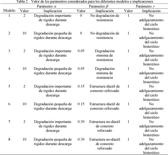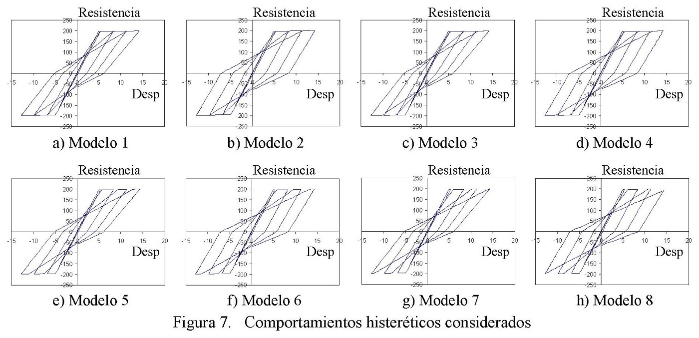Parte de la transparencia que se exige tengan las nuevas metodologías de diseño sísmico, se centra en que el diseñador tenga una idea clara de la respuesta sísmica esperada de la estructura sismorresistente cuando se le somete a las excitaciones sísmicas de diseño. Entre otras cosas, esto implica un entendimiento razonable de cómo afecta el comportamiento histerético de la estructura su respuesta y desempeño sísmicos. Este tipo de inquietudes se ha reflejado en algunos lineamientos de diseño sísmico; particularmente el FEMA 273 (Federal Emergency Management Agency 1997), que contempla explícitamente el comportamiento histerético de la estructura durante la estimación de sus demandas sísmicas. En el caso de las estructuras desplantadas en la Zona del Lago del D.F., esta transparencia debe reflejarse en la consideración explícita del comportamiento histerético y el uso de un criterio de daño acumulado. Al respecto, Terán y Espinoza (2003) realizaron un estudio del efecto de la degradación del ciclo histerético en la demanda de resistencia que, según el criterio de Park y Ang, requieren las estructuras sismorresistentes para no fallar por fatiga de bajo número de ciclos. En dicho estudio, se consideraron los comportamientos histeréticos ilustrados en la Figura 7. De manera general puede decirse que los comportamientos presentados, modelados a partir del modelo de los tres parámetros (Kunnath et al. 1990), corresponden a la respuesta cíclica de elementos y estructuras de concreto reforzado con diferente detallado. Los valores de los tres parámetros asignados a cada uno de los modelos que se consideraron se resumen en la Tabla 2. Cabe aclarar que el modelo de los tres parámetros original considera una envolvente trilineal que toma en cuenta explícitamente el agrietamiento del elemento de concreto reforzado, y que los resultados presentados en este artículo se obtuvieron modificando el modelo original de los tres parámetros, de manera que se consideró una envolvente bilineal (físicamente esto equivale a considerar que el sistema de concreto reforzado ya esta agrietado en el momento que se le sujeta a la excitación sísmica).