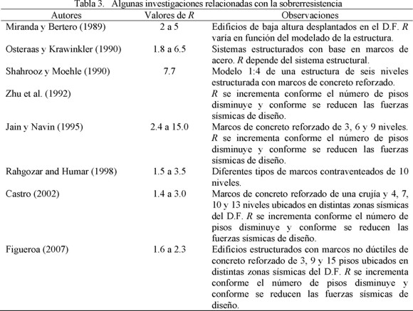 La Tabla 3 cita algunas de las numerosas investigaciones (principalmente analíticas) que se han llevado a cabo para establecer los factores que juegan un papel importante en el valor de la sobrerresistencia. Es importante destacar que las investigaciones no han arrojado hasta el momento una evidencia contundente que permita cuantificar confiablemente dicho parámetro. Quizá la razón mas importante para esto sea que los diferentes investigadores han obtenido valores de sobrerresistencia que son muy diferentes entre si; esto como resultado de un manejo poco congruente de las causas de sobrerresistencia. Además, es importante mencionar que la gran mayoría de los estudios analíticos no consideran varios factores de importancia en la estimación de la sobrerresistencia, tal como la contribución de los elementos no estructurales, la contribución de algunos componentes estructurales secundarios, la variación del perfil de fuerzas laterales, el enfoque o filosofía que usa el ingeniero estructural durante el diseño sísmico de la estructura, etc.