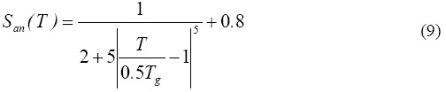 donde SaDEG(T,μu) corresponde a la resistencia (pseudo-aceleración) de diseño para un sistema degradante con periodo T y capacidad última de ductilidad μu SaEPP(T,μu) es la resistencia leída, en función de T y μu, de un espectro de resistencia derivado de comportamiento elasto-plástico perfecto; y San es el factor de corrección que toma en cuenta el efecto del comportamiento histerético en el requerimiento de resistencia lateral. Aunque San depende de las propiedades estructurales de la estructura sismorresistente, las características dinámicas de la excitación sísmica, y el criterio utilizado para evaluar la falla de la estructura, algunas de estas dependencias son relativamante débiles. Tomando esto en consideración, Terán y Espinoza (2003) han propuesto la siguiente expresión para estimar el valor de San en la Zona del Lago del D.F. (los resultados arrojados por esta expresión se grafican en negro en las graficas presentadas en la Figura 8):
