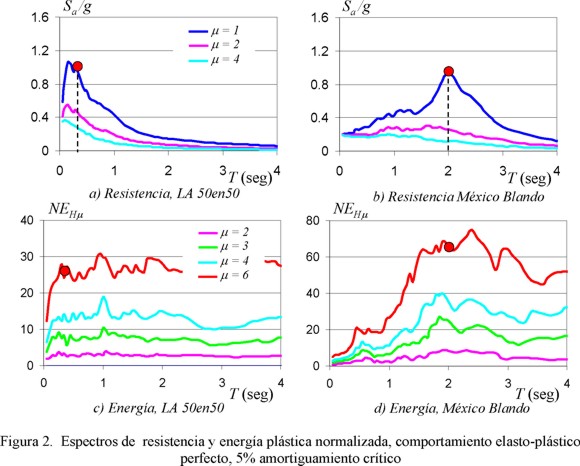 La Figura 2 muestra espectros de resistencia obtenidos a partir de sistemas de un grado de libertad (1GL) con comportamiento elasto-plástico perfecto y 5% de amortiguamiento crítico (Sa denota pseudo-aceleración). Los círculos identifican el periodo de esquina (Tg), definido como el periodo a partir del cual el espectro de resistencia se reduce después de haberse maximizado en un punto o en una meseta. Note que mientras LA 50en50 tiene un periodo de esquina cercano a 0.3 seg, el de México Blando está cercano a 2.0 seg. La Figura 2 también muestra espectros de energía plástica normalizada para ductilidad máxima constante. Puede observarse que las demandas máximas de NEHμ para México Blando son entre dos y tres veces mayores que las observadas para los movimientos LA, y que el contenido de energía de México Blando se maximiza alrededor de su periodo de esquina de 2 segundos.