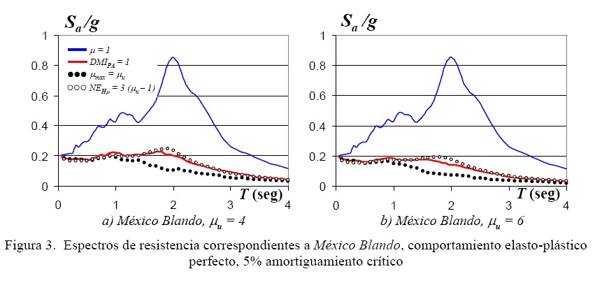 Varios proyectos de investigación sugieren que en suelo firme, el diseño sismorresistente debe avocarse a controlar la demanda máxima de deformación plástica en las estructuras sismorresistentes. En particular, los umbrales de deformación máxima planteados por enfoques de diseño por desplazamiento parecen lo suficientemente conservadores para garantizar un diseño sísmico adecuado de las estructuras desplantadas en suelo firme (Terán y Jirsa 2003). Sin embargo, un criterio de control del desplazamiento máximo no parece resultar en un diseño adecuado para algunas estructuras desplantadas en la Zona de Lago del D.F. Varios estudios han mostrado consistentemente la severidad de las demandas de energía en estructuras ubicadas en dicha zona, y la preocupación que varios investigadores mexicanos tienen en cuanto a sus implicaciones de diseño (Terán 1998, Rodríguez y Ariztizabal 1999, Huerta y Reinoso 2002, Bojórquez y Ruiz 2004, Arroyo y Ordaz 2006). Para ilustrar lo anterior, a continuación se utilizan los índices de daño presentados con anterioridad para establecer las demandas de resistencia requeridas por estructuras dúctiles con comportamiento elasto-plástico perfecto cuando se les sujeta a los movimientos del terreno incluidos en México Blando. Mientras que para el índice de Park y Ang (DMIPA = 1) se utilizó la Ecuación 2 con β = 0.15, el índice de Terán y Jirsa se utilizó a través la Ecuación 4. En la zona espectral con altas demandas de energía para México Blando (T cercano a 2 segundos), la Figura 3 muestra que los criterios que consideran las demandas de energía (Terán y Jirsa, Park y Ang) resultan en una resistencia lateral considerablemente mayor que la que arroja el criterio de ductilidad máxima (μmax = μu).