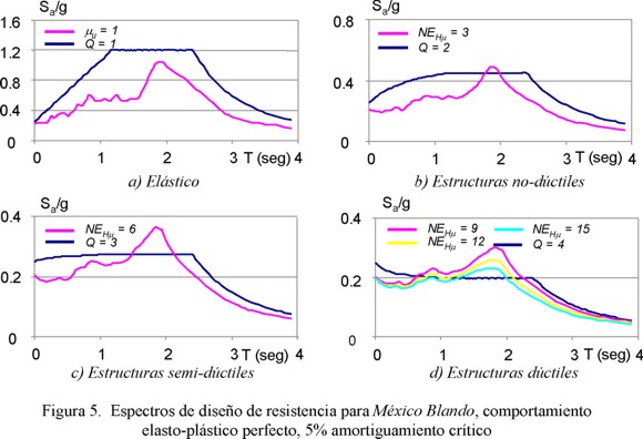 Aunque el valor del factor de reducción planteado por el Apéndice A sólo debe juzgarse en función de los espectros elásticos de resistencia definidos en el mismo, el hecho es que las NTCDS parecen sobreestimar la reducción que debe hacerse a los espectros elásticos para obtener la resistencia lateral de diseño de algunas estructuras dúctiles. Esto se ilustra con la ayuda de la Figura 5. Las curvas graficadas en color oscuro representan los niveles de diseño de resistencia lateral que el Apéndice A asigna a estructuras desplantadas en un sitio con periodo dominante de 2 segundos y con diferentes valores de factor de comportamiento sísmico (Q). En curvas de color claro se presentan las demandas de resistencia lateral derivadas del criterio de Terán y Jirsa (Ecuación 4). Mientras que para estructuras no dúctiles se comparan los resultados derivados del Apéndice A para Q de 2 con los derivados del criterio de Terán y Jirsa para μu de 2; para las estructuras semi-dúctiles se comparan demandas de resistencia para Q y μu de 3; y para estructuras dúctiles demandas para Q de 4 con aquellas derivadas a partir de μu de 4, 5 y 6. Mientras que el Apéndice A propone un espectro elástico conservador con respecto al derivado para México Blando (Figura 5a), este nivel de conservadurismo se erosiona progresivamente con respecto a un incremento de Q, hasta resultar en valores del lado de la inseguridad para estructuras dúctiles (Figura 5d). Note que en la Figura 5d se ha considerado un amplio rango de valores de μu (de 4 a 6) para caracterizar la capacidad de deformación última de estructuras dúctiles. Aunque es común caracterizar dicha capacidad con un valor de 4 con fines de diseño, la evidencia experimental sugiere que esta capacidad puede fácilmente alcanzar valores entre 5 y 6 (Reyes 2000). Asumiendo un valor de μu igual a 6 como representativo (NEHμ = 15), la figura refleja un ligero sub-diseño para estructuras con comportamiento elasto-plástico perfecto y periodo similar o ligeramente menor al periodo dominante del terreno.