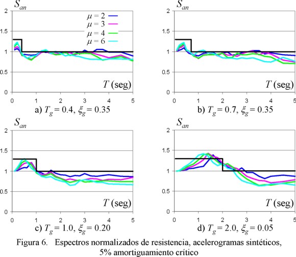 Por muchos años se consideró que la degradación del ciclo histerético tenía poco efecto en los requerimientos de resistencia lateral de las estructuras sismorresistentes, de tal manera que el diseño de resistencia se hacía sin consideración explícita del comportamiento histerético de la estructura. Sin embargo, estudios relativamente recientes (Terán 1996, Miranda y Ruiz 1999, Espinoza y Terán 2000, Miranda y Ruiz 2002, Terán y Espinoza 2003, Ruiz y Miranda 2004) sugieren que para excitaciones sísmicas generadas en suelos blandos, las demandas sísmicas en sistemas que exhiben degradación de rigidez pueden llegar a ser significativamente diferentes que aquellas estimadas a partir de espectros establecidos a partir de comportamiento elasto-plástico perfecto. Esto se ilustra con la Figura 6, que considera el efecto de la degradación del ciclo histerético en los requerimientos de resistencia de sistemas de 1GL a través de espectros normalizados de pseudo-aceleración para ductilidad máxima constante (San). Estos espectros se presentan de tal manera que para un valor dado de ductilidad máxima, la resistencia lateral requerida por un sistema de 1GL con degradación del ciclo histerético se normaliza por su correspondiente resistencia lateral derivada de un sistema de 1GL con las mismas características mecánicas (resistencia, rigidez y amortiguamiento) pero con comportamiento elasto-plástico perfecto. Considere a manera de ejemplo que una ordenada de dos en un espectro normalizado de resistencia implica que la resistencia requerida por el sistema de 1GL con degradación de rigidez es el doble de la resistencia requerida por el sistema con comportamiento elasto-plástico perfecto para controlar su demanda máxima de ductilidad dentro del mismo umbral. Las tendencias mostradas se establecieron a partir del uso de acelerogramas sintéticos. Estos movimientos se obtuvieron a partir de colorear con un filtro Kanai-Tajimi una serie de ruidos blancos gaussianos con el fin de proveerles un contenido de frecuencias que corresponda a diferentes tipos de suelos. Una vez coloreados, los acelerogramas se filtraron para eliminarles las frecuencias bajas y se modularon en el dominio del tiempo para que exhibieran una tasa de liberación de energía congruente con la observada en acelerogramas reales. Para una discusión detallada del proceso utilizado para generar los sismos sintéticos, el lector puede acudir a Terán (1996).