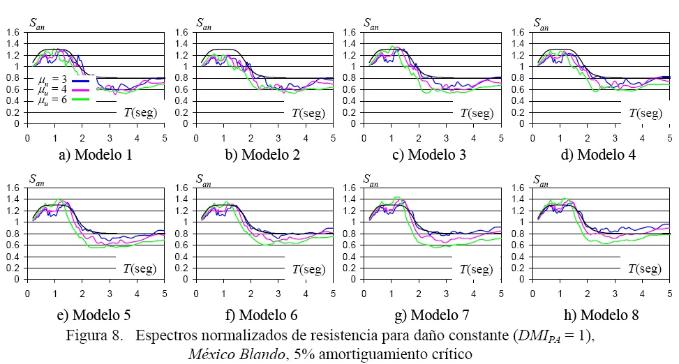 La Figura 8 muestra la media de los espectros normalizados de pseudo-aceleración para daño constante de las siete excitaciones sísmicas agrupadas en México Blando. Es interesante observar que los resultados obtenidos para los ocho modelos no difieren mucho entre sí, lo que sugiere que mientras el ciclo histerético no exhiba adelgazamiento, las particularidades del mismo no afectan de manera importante la resistencia lateral de diseño del sistema degradante. Esto implica que no se requiere conocer las particularidades del comportamiento histerético de una estructura dúctil para hacer una estimación razonable de su resistencia lateral de diseño. Conforme discuten en detalle Terán y Espinoza (2003), el criterio de daño constante arroja valores de San que son muy similares a los derivados a partir de un criterio de ductilidad máxima.