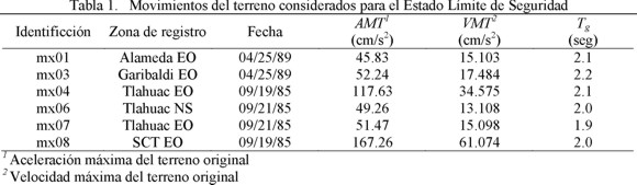 Para la obtención de los espectros de diseño se establecieron dos grupos de acelerogramas registrados en la Zona del Lago del D.F., y caracterizados por tener un periodo dominante de excitación (Tg) de 2 seg. El grupo de acelerogramas correspondientes a la excitación sísmica de diseño para el estado límite de seguridad agrupa los 6 acelerogramas incluidos en la Tabla 1, los cuales fueron escalados para que exhibieran una velocidad máxima del terreno igual a la de movimiento del terreno registrado durante 1985 en la Secretaría de Comunicaciones y Transportes, dirección este-oeste (SCTEO 1985). En cuanto al estado límite de servicio, se agruparon los 12 acelerogramas contenidos en la Tabla 2. Los acelerogramas en este segundo grupo se escalaron de tal manera que exhibieran una velocidad máxima del terreno igual a la cuarta parte de la velocidad máxima del terreno correspondiente a SCTEO 1985. Los espectros de diseño corresponden a la media más una desviación estándar (σ) de los espectros correspondientes a cada acelerograma dentro de un grupo, y se obtuvieron a partir de comportamiento elasto-plástico perfecto, de tal manera que sus ordenadas deben ajustarse para considerar explícitamente el comportamiento degradante de la estructura dúctil de concreto reforzado.