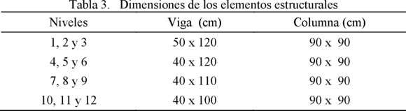 Conforme a la metodología propuesta, el primer paso del diseño local preliminar es el dimensionado de los elementos estructurales en función del valor de Tmax. Para el edificio bajo consideración, se realizó una serie de análisis de valores característicos con el programa SAP2000 para establecer las dimensiones de vigas y columnas. Dada la importancia de la contribución de la losa a la rigidez a flexión de las vigas, se consideró, a partir de las reglas establecidas por Pantazopoulou y French (2001), un ancho de losa tributario a las vigas. El agrietamiento de los elementos estructurales de concreto reforzado se consideró de acuerdo con las recomendaciones del FEMA 273 (Federal Emergency Management Agency 1997). Conforme a ellas, el momento de inercia de las vigas se tomó como el 50% de su inercia gruesa, y el de las columnas como 70% de su inercia gruesa. Después de varias iteraciones, se establecieron las dimensiones resumidas en la Tabla 3. El proceso de dimensionado consideró el uso de secciones tipo para simplificar el procedimiento constructivo del edificio. Esto es particularmente cierto para las columnas, cuyo dimensionado se resolvió con una sola sección para todas ellas.