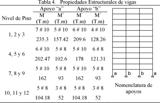 La Tabla 6 resume las propiedades estructurales de las vigas de los marcos del edificio. Las unidades de rotación son radianes y las de curvatura 1/m. Para obtener la inercia del elemento estructural (Ie) se promediaron las inercias agrietadas positiva y negativa estimadas en los extremos de los elementos.