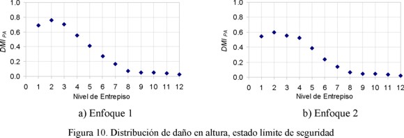 donde φu es la capacidad última de curvatura del elemento, φmax es la curvatura máxima demandada por la excitación sísmica, EH es la energía plástica disipada por la articulación plástica y My es el momento de fluencia. Un signo positivo implica flexión positiva; un signo negativo, flexión negativa. Se utilizó β de 0.15, valor que caracteriza la estabilidad del ciclo histerético de elementos con buen detallado sísmico. Se plantearon dos enfoques para establecer el nivel de daño estructural en las vigas del marco a partir de la Ecuación 8. El primer enfoque se basa en estimar el valor DMIPA en los dos extremos del elemento, y asignarle a este el mayor de estos dos valores. El segundo enfoque consiste en asignarle al elemento el valor promedio de los valores de DMIPA en sus extremos. El valor de DMIPA para un entrepiso se establece a partir de promediar los valores de DMIPA estimados para todas las vigas del mismo. La Figura 10 muestra la distribución de daño estructural que exhiben los diferentes entrepisos para los dos enfoques (media más una desviación estándar). Note que el mayor nivel de daño estructural tiende a presentarse en los primeros niveles del edificio. La media del daño en el entrepiso más dañado es de 0.62, mientras que la media más una desviación estándar exhibe un valor cercano a 0.8. Dado que el último valor está por debajo del umbral definido por el valor de uno, puede considerarse que el marco satisface adecuadamente las condiciones de desempeño estructural impuestas por los objetivos de diseño.
