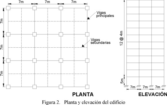 La Figura 2 muestra la planta y elevación del edificio considerado en este artículo para ilustrar el uso de la metodología que aquí se propone. El edificio es regular (simétrico) en cuanto a masa, resistencia y rigidez; tiene una planta definida por 3 crujías de 7 m de claro en cada una de las dos direcciones principales, y cuenta con doce pisos con altura de entrepiso de 4 m, excepto para la planta baja que exhibe una altura de 5 m. Para simplificar el diseño, se han asignado las mismas dimensiones y armado a los elementos estructurales de los cuatro marcos alineados en cada dirección del edificio. La resistencia nominal de los materiales son f′c de 250 kg/cm2 para el concreto y fy de 4200 kg/cm2 para el acero de refuerzo.