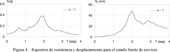 La Figura 3 muestra los espectros de diseño correspondientes al estado límite de seguridad. En un primer paso se establecieron los espectros de resistencia y desplazamiento para diferentes valores de ductilidad acumulada constante, ξ de 0.05 y comportamiento elasto-plástico perfecto. En un segundo paso, las ordenadas de los espectros, tanto de resistencia como de desplazamiento, fueron ajustados conforme a lo indicado por Terán y Espinoza (2008) para tomar en cuenta la degradación del ciclo histerético de las estructuras de concreto reforzado ubicadas en la Zona del Lago. La Figura 4 muestra los espectros de diseño para el estado límite de servicio, los cuales se establecieron para comportamiento elástico y ξ de 0.02. Vale la pena mencionar que dentro de un contexto normativo, los espectros de diseño deben formularse de tal manera que tomen en cuenta la incertidumbre en la estimación de los periodos de la estructura y del movimiento del terreno. Esto por lo general resulta en que los espectros de diseño se definan de tal manera que exhiban una meseta relativamente ancha alrededor de la zona de máxima amplificación dinámica.