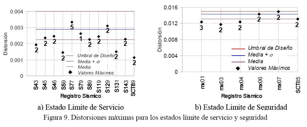 Mientras que para el estado límite de servicio se planteó el control del daño no estructural a partir de controlar la distorsión máxima de entrepiso dentro del umbral de 0.004, el control del daño estructural se planteó a través de mantener a los elementos estructurales dentro de su rango elástico de comportamiento. Para evaluar el desempeño del marco de doce pisos para el estado límite de servicio, se sometió al modelo del DRAIN 2DX a la familia de acelerogramas resumida en la Tabla 2. La Figura 9a muestra los valores de distorsión máxima para cada acelerograma, y compara la media más una desviación estándar de la distorsión máxima con su correspondiente valor de diseño. El número que se ha asignado a cada diamante de la figura corresponde al número de piso del edificio donde se presentó la distorsión máxima.