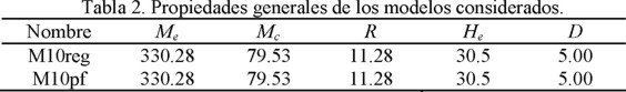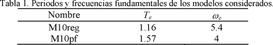 Se analizó la respuesta de un edificio con 10 niveles. Para ello se utilizaron los dos modelos antes mencionados, uno con regularidad estructural en altura (M10reg) y uno con primer piso flexible (M10pf). Las frecuencias naturales y algunas de las propiedades de cada uno de los modelos se reportan en las tablas 1 y 2, respectivamente.