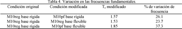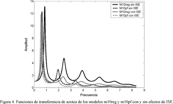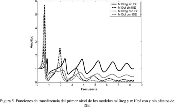 Con los resultados de la tabla 4 se puede apreciar que a medida que el parámetro de interacción γ = TeHs/TsHe reportado en la tabla 3 tiene valores más pequeños, la influencia de los efectos de ISE es mayor. Como puede observarse, para el modelo con piso blando (M10pf) los valores de este parámetro son mayores que para el modelo regular (M10reg), por lo cual no es sorpresivo que la diferencia de las amplitudes en la funciones de transferencia de los casos con y sin ISE en el modelo M10pf sea más pequeña que la diferencia que existe entre las amplitudes de las funciones de transferencia del modelo (M10reg) con y sin ISE.