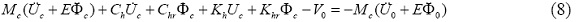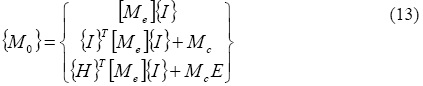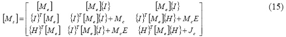 donde [Me], [Ce] y [Ke] son las matrices de masa, amortiguamiento y rigidez de la estructura con base rígida; J′c = Jc − McE2 es el momento de inercia con respecto al centroide de la cimentación. Además, V0 = {I}T {[Ce]{