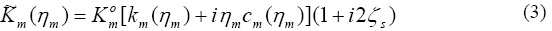 donde m indica traslación horizontal (m=h), cabeceo (m=r) o acoplamiento (m=hr). El factor complejo (1 + i2ζs) intenta aislar el efecto del amortiguamiento material del suelo ζs en los coeficientes de rigidez y amortiguamiento. Por su parte, Kom es la rigidez estática mientras que km y cm son respectivamente los coeficientes de rigidez y amortiguamiento geométrico del suelo dependientes de la frecuencia normalizada ηm, definida como