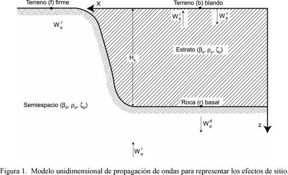 En el modelo investigado se consideraron tanto los efectos de sitio como los efectos de ISE. Para calcular los efectos de sitio se utilizó el modelo unidimensional de propagación de ondas mostrado en la figura 1. Esta aproximación es adecuada debido a la gran extensión del valle de México y al gran contraste entre las velocidades de ondas de corte de las arcillas superficiales y el basamento.