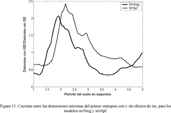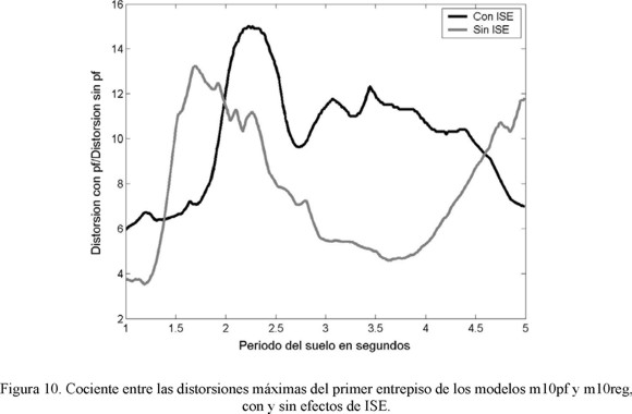 Como es bien sabido, las fuerzas a las que estarán sujetas las estructuras no son el único parámetro que interesa para evaluar su comportamiento sísmico. Una medida importante para el desempeño estructural es la distorsión máxima de entrepiso. En este caso se ha decidido estudiar el comportamiento del primer entrepiso. En la figura 10 se presenta la variación del cociente entre las distorsiones máximas calculadas para los modelos M10pf y M10reg, para las dos condiciones de apoyo (rígido y flexible). Aunque los valores del modelo M10pf siempre son mayores que los del modelo M10reg, se observa que la forma de los cocientes de distorsiones máximas es idéntica a la forma de los cocientes de cortantes basales máximos, lo que manifiesta la posibilidad de que la presencia de una discontinuidad importante en rigidez dentro del sistema afecte de igual manera, aunque a distinta escala, tanto las fuerzas a las que estará sujeta la estructura como las distorsiones que sufrirá. Este factor de escala está dado por la relación de las rigideces del primer entrepiso de los modelos M10reg y M10pf. Para este caso el factor es igual a 7.4.