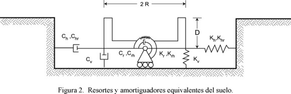 Para considerar la interacción inercial se sustituyen tanto la rigidez como el amortiguamiento del suelo por medio de los resortes y amortiguadores mostrados en la figura 2, cuyas propiedades dependen de la frecuencia.