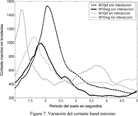 En la figura 7 se presenta la variación del cortante basal máximo en función del periodo dominante del sitio. Se utilizaron los modelos M10reg y M10pf, cada uno considerando base rígida y base flexible. En todos los casos se consideraron los efectos de sitio suponiendo un suelo con velocidad de propagación de ondas de cortante de βs = 50 m/s. Puede observarse que el cortante basal resonante se presenta para periodos de sitio cercanos a los periodos de cada uno de los sistemas (ver tablas 1 y 4). Claramente se observa que el periodo del sistema se alarga más por ISE que por piso flexible.