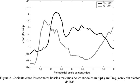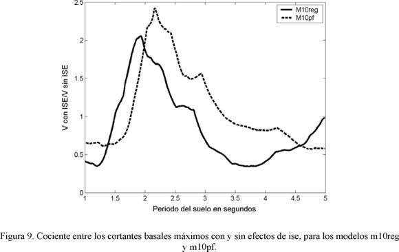 Para medir la importancia de los efectos de ISE, se compararon las respuestas de cada uno de los modelos (M10reg y M10pf) sobre base flexible con respecto a las respuestas de estos mismos modelos considerando base rígida. Los resultados se muestran en la figura 9. La forma de los cocientes en función del periodo del sitio es similar para ambos modelos. Salvo en las zonas de resonancia, los respectivos cortantes basales son menores cuando se considera la ISE.