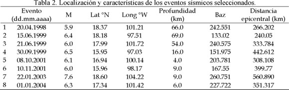 De los registros de movimiento fuertes obtenidos durante el periodo de operación del arreglo TXCL, seleccionamos ocho eventos con magnitud mayor a seis (tabla 2) registrados en al menos dos estaciones y cuyo registro estuviera completo en los tres componentes del movimiento. Los eventos seis y siete de esta tabla están registrados en los instrumentos del arreglo vertical, el primero en las profundidades 0, 2, 10, 20 30 y 40 m y el segundo en las profundidades 0, 2, 10 y 20 m.