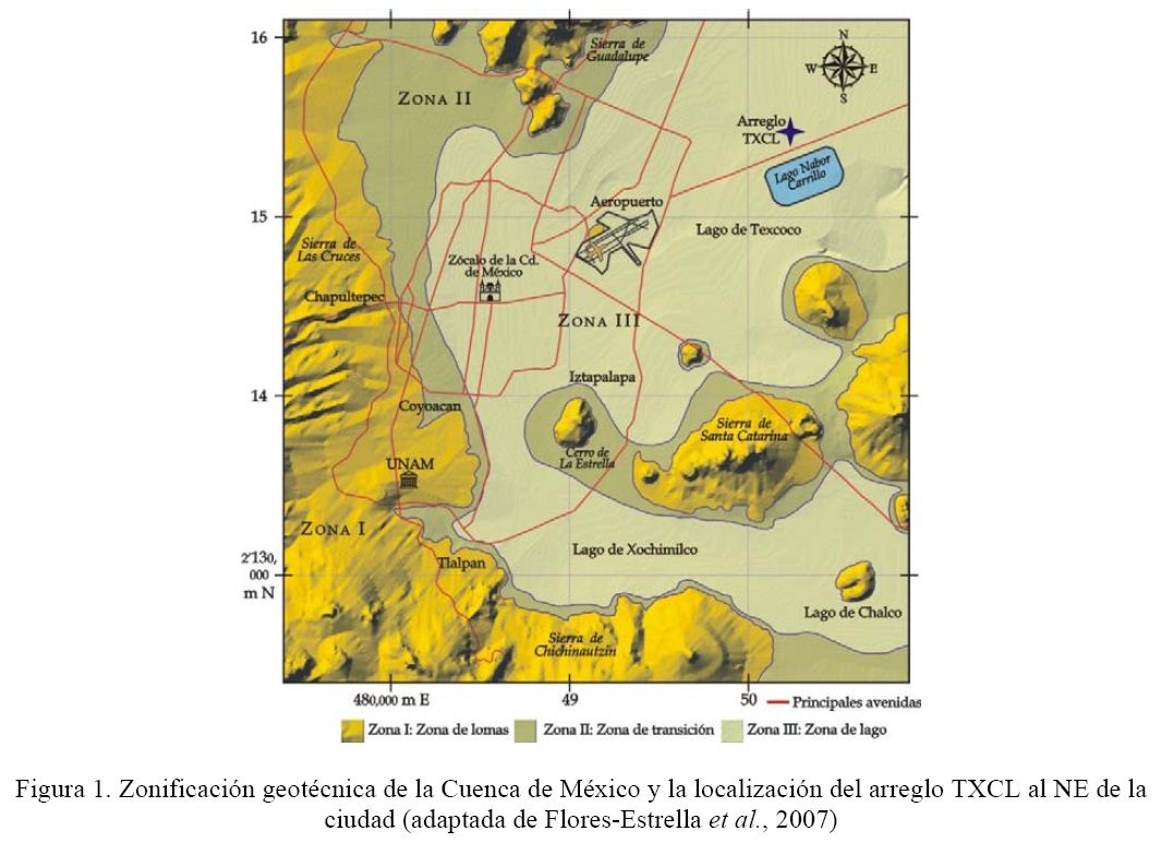 En un proyecto conjuntos de los Institutos de Ingeniería y de Geofísica de la UNAM y como un esfuerzo por conocer la respuesta sísmica en arcillas vírgenes de la Cuenca de México, en 1995 se instaló un arreglo instrumental sobre las arcillas del Lago de Texcoco, dentro de la Reserva Natural a cargo de la Comisión Nacional del Agua (CNA), al NE de la Ciudad de México (arreglo TXCL en la figura 1). El objetivo del arreglo instrumental Texcoco, TXCL, fue el de monitorear la propagación de ondas superficiales coherentes y enriquecer el conocimiento sobre el campo de ondas que se propaga ante la incidencia de movimientos fuertes (Stephenson y Lomnitz, 2005).