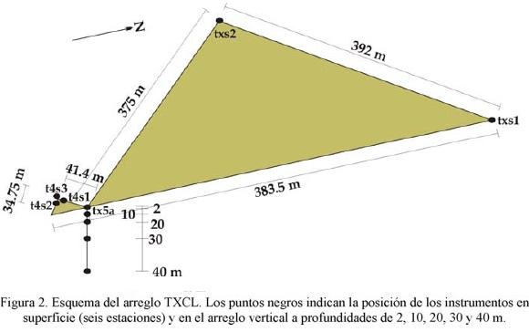 El arreglo instrumental TXCL funcionó de 1995 a 2004; en la figura 3 se muestra un esquema de éste, los puntos negros indican la posición de los acelerógrafos, tanto en superficie como en el arreglo vertical. El arreglo TXCL consistió de seis acelerográfos en superficie formando dos arreglos triangulares con aberturas de aproximadamente 40 y 300 m; en un vértice del arreglo de 300 m (tx5a en la figura 2) se instalaron sensores en las profundidades de 2, 10, 20, 30 y 40 m. En la figura 3 se obvia la posición del sensor en dos metros de profundidad, pues la escala no permite verlo claramente. En las estaciones txs1 y txs2 los instrumentos que se usaron fueron acelerográfos ETNA, de Kinemetrics y para las estaciones t4s1, t4s2, t4s3 y txs5a se usaron instrumentos K2. En ambos tipos de instrumentos la velocidad de muestreo fue de 100 muestras por segundo.