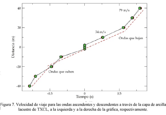 Los tiempos en que aparecen los máximos de las formas de onda de la decovolución y la distancia entre receptores fueron utilizados para construir curvas de tiempo de viaje que se muestran en la figura 7. Debido a que los tiempos de viaje de las ondas ascendentes y descendentes son los mismos en ambas direcciones, los lugares geométricos correspondientes se sobreponen en la figura 6. Los tiempo de arribo de las ondas ascendentes definen claramente dos pendientes, que indican la velocidad de ondas de corte; entre la superficie y 20 m de profundidad esta velocidad es de 34 m/s y entre 20 y 40 m de profundidad es de 79 m/s. En general, los tiempos de las ondas ascendentes pueden ser interpolados en las pendientes de estas dos velocidades.