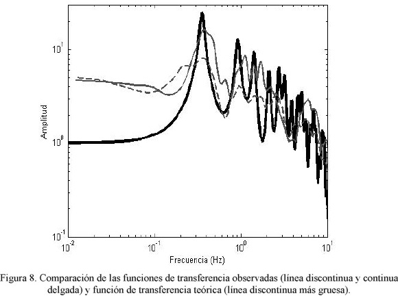 Con el fin de verificar si este modelo es capaz de reproducir la respuesta de sitio observada (figuras 4 y 5), calculamos la función de transferencia mediante el método de Haskell-Thompson (Aki y Richards, 1980) considerando propagación vertical de ondas SH. En la figura 8 se muestran las comparaciones de la función de transferencia del modelo teórico -representada con una línea negra gruesa- con los cocientes H/V (línea continua delgada) y con los cocientes SSR de los componentes radial y transversal (líneas discontinuas). En esta figura se puede ver que la función de transferencia teórica tiene su frecuencia fundamental en 0.36 Hz, mientras que las funciones empíricas la tienen en 0.37 Hz; los niveles de amplificación estimados teóricamente corresponden más con las amplificaciones relativas al movimiento en la estación Estanzuela. Respecto a los armónicos superiores, el primer armónico de la función teórica corresponde en frecuencias con el definido por los cocientes H/V, mientras que el segundo corresponde con el estimado en los cocientes SSR y su amplitud es más parecida, aunque sigue siendo sobreestimada.