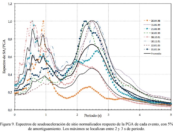 En la figura 9 se pueden ver dos bandas con seudoaceleraciones máximas: la primera entre 0 y 1 s de periodo, con una seudoaceleración normalizada cercana a 0.6 g y la segunda entre 2 y 3 s de periodo con valores de seudoaceleración de aproximadamente 0.8 g. El intervalo entre 2 y 3 s de periodo corresponde con el periodo fundamental del sitio, mientras que el intervalo en periodos menores corresponde a un tercio del fundamental y está asociado con el primero modo superior.
