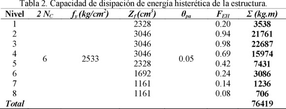 Para determinar el numerador del lado izquierdo de la ecuación 20 que corresponde a la capacidad total de disipación de energía histerética de la estructura se utiliza la tabla 2. En este ejemplo se supuso que θpa=0.05 (Akbas et al. 2001, Choi y Shen, 2001), que para fines conservadores corresponde al límite inferior de capacidad de rotación obtenido en pruebas experimentales.