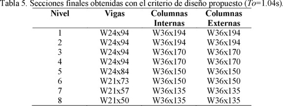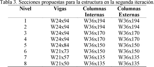 Debido a que el diseño no fue satisfactorio, se procede a rediseñar la estructura, incrementando ligeramente las secciones, y se repite el procedimiento a partir del tercer paso. El nuevo diseño se ilustra en la tabla 3 y se regresa al paso 2.