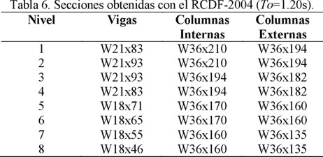 En esta parte se presenta el desempeño sísmico del marco estructural diseñado con el procedimiento propuesto, así como de un marco con la misma configuración estructural pero diseñado de acuerdo con el RCDF 2004. El marco obtenido con el Reglamento, fue diseñado usando parámetros que son consistentes con aquellos utilizados en el ejemplo ilustrativo; particularmente: a) se utilizó un factor de comportamiento sísmico Q=3; y b) espectros correspondientes a la zona IIIb del valle de México. Una información detallada acerca de este diseño se encuentra en (Díaz, 2006). Las secciones finales de ambos diseños se ilustran en las tablas 5 y 6.